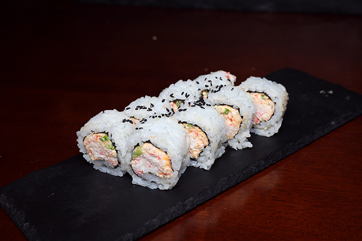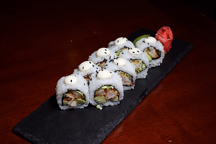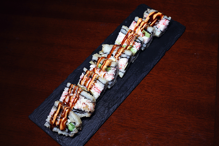 Battered and deep-fried crispy roll with avocado and crab salad; finished with soy caramel sauce and spicy mayo