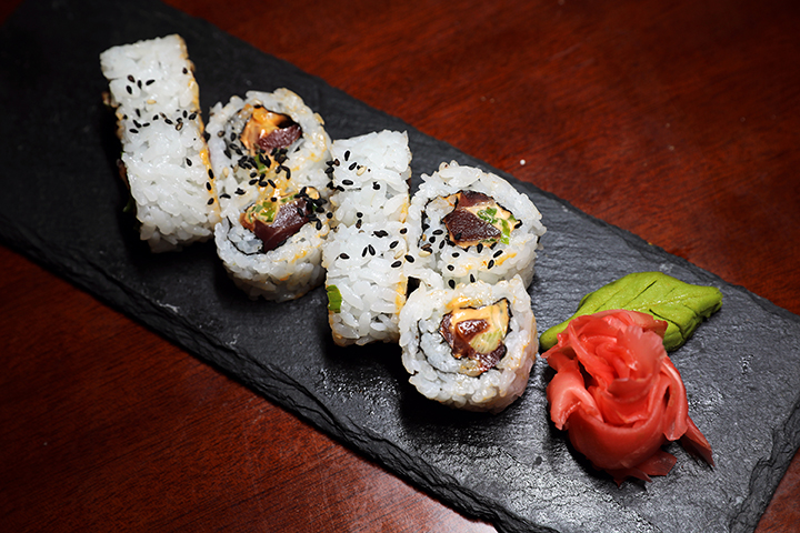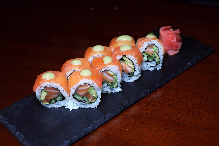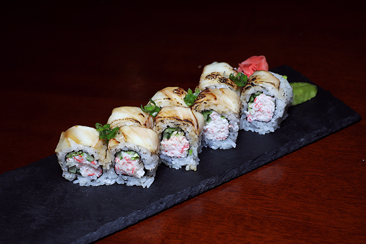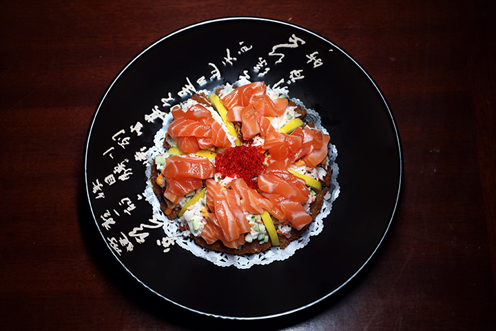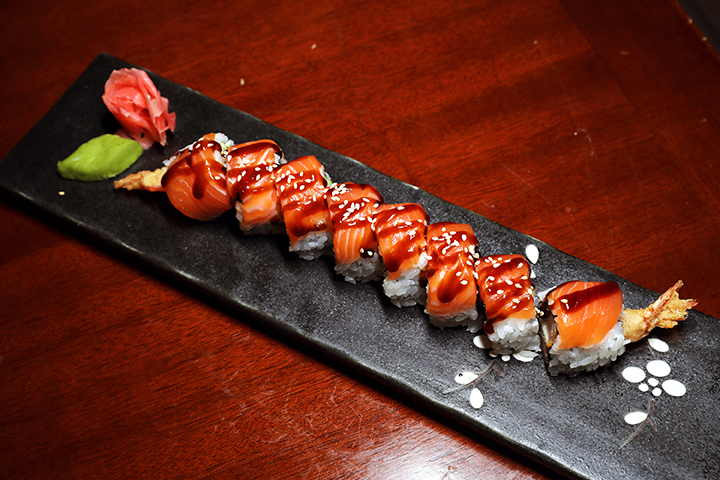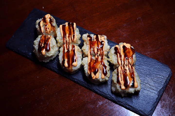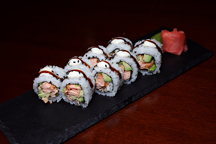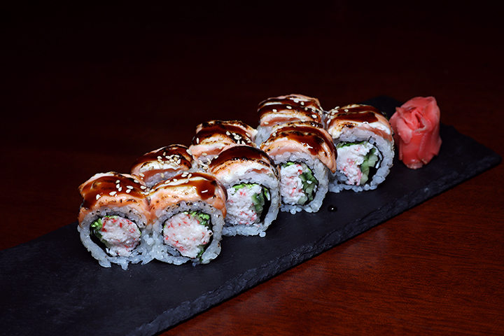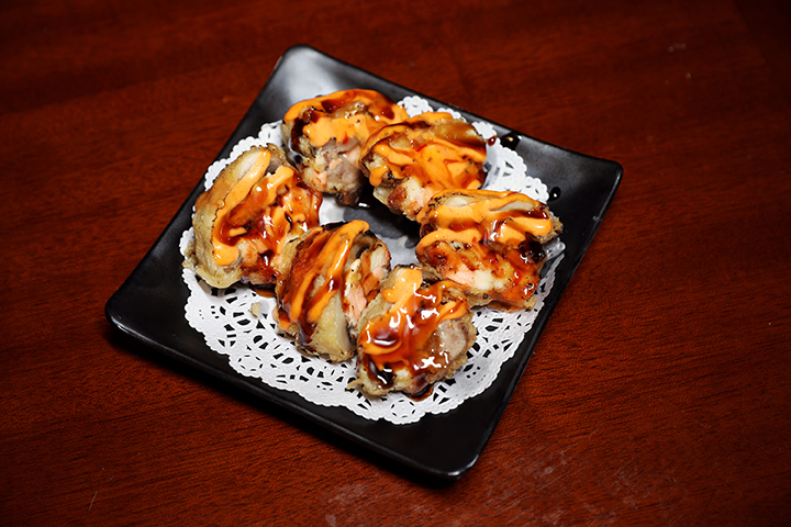 Battered and deep-fried crispy roll with smoked salmon, cream cheese, avocado and crab salad; finished with soy caramel sauce, spicy mayo and Thai chili sauce