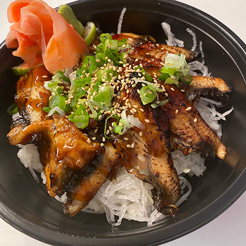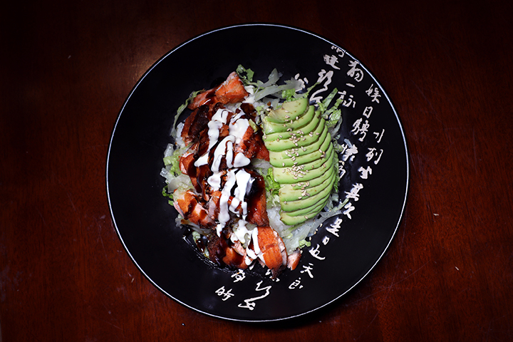 Bed of sushi rice topped with with BBQ salmon and avocado