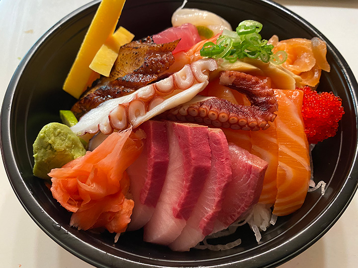 Bed of sushi rice topped with a variety of chef's choice of fresh raw fish