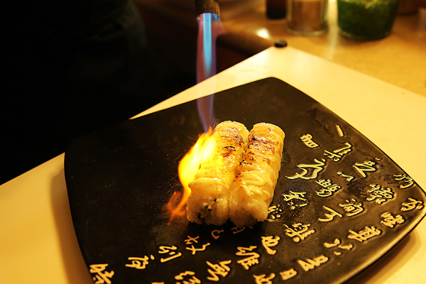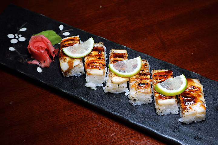 Charcoaled whole sea eel; ginger, kampyo (marinated squash) roll; finished with tsume sauce