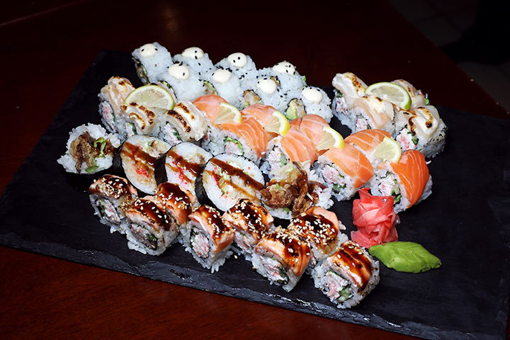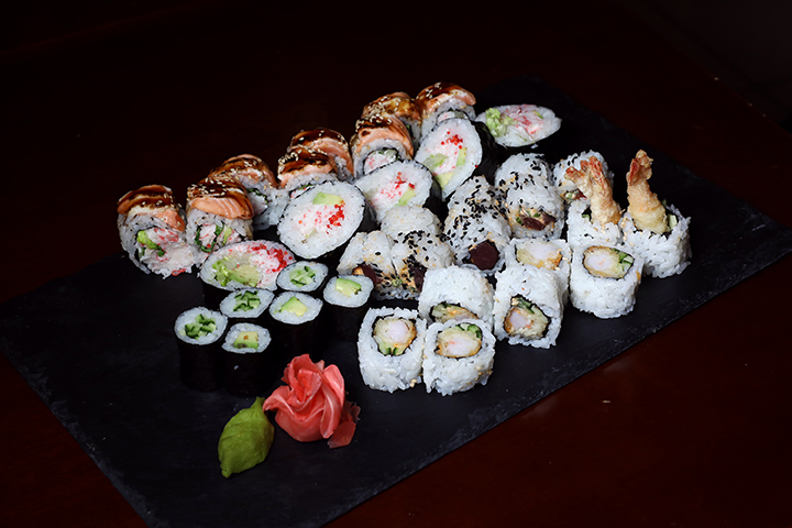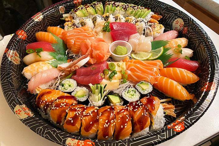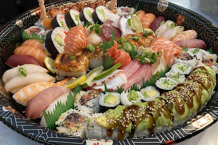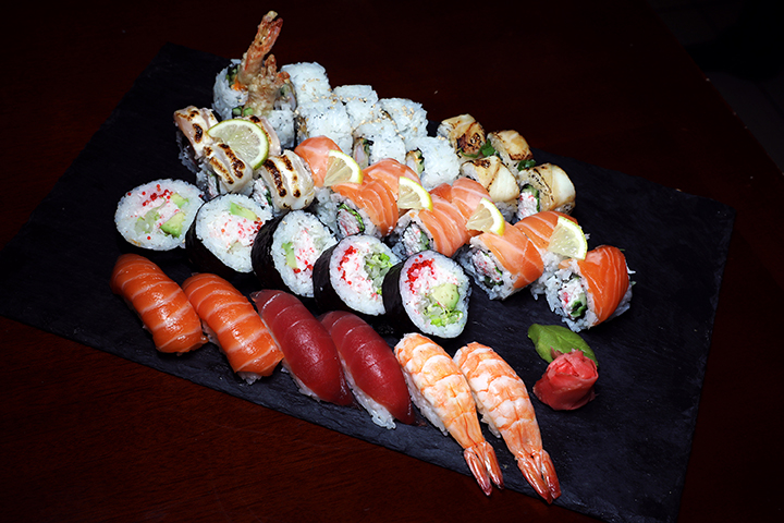 Sushi (16pcs), sashimi (24pcs), Red Nigiri-Ya Roll, The YAM Topped with Avocado Roll, Salmon Oshi Sushi, House California Roll, Spicy Tuna Roll, Avocado Roll (3pcs), Cucumber Roll (3pcs)