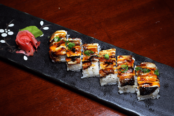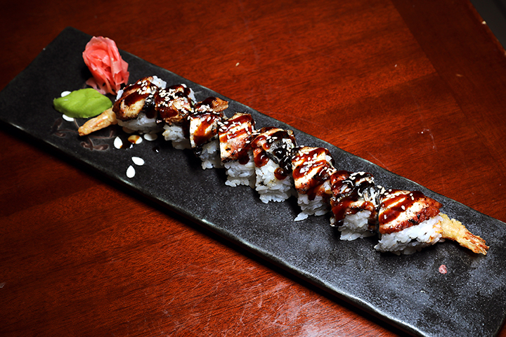Freshwater eel on top; crunchy shrimp, freshwater eel, cucumber roll with soy caramel sauce and sesame