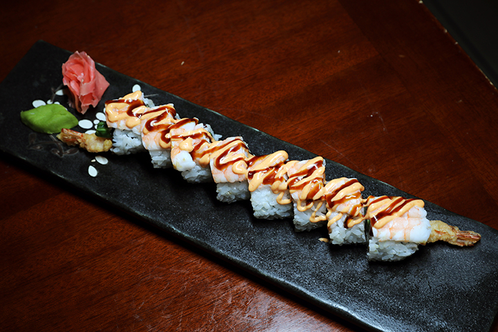 Sushi shrimp on top; tempura shrimp, avocado, cucumber; finished with creamy mayo and soy caramel sauce