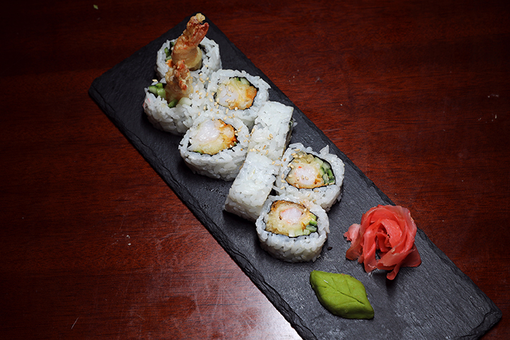 Tempura battered shrimp, cucumber, creamy mayo; sprinkled with white sesame seed