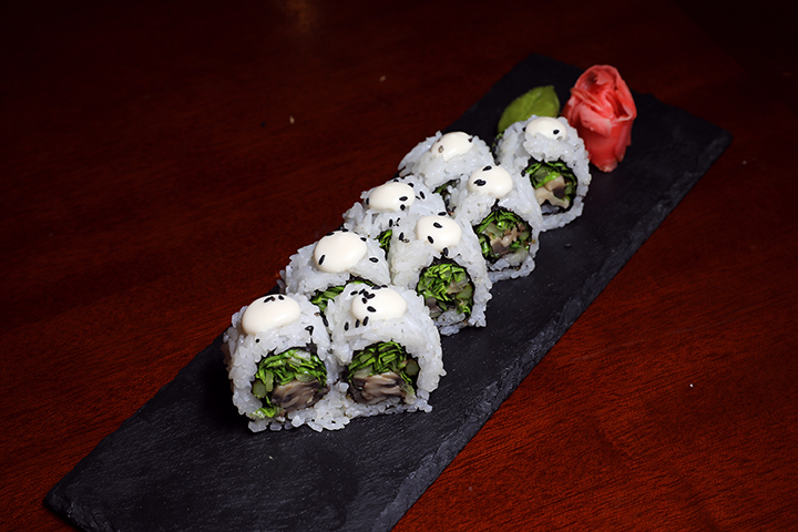 Sweet potato tempura, romaine, scallions, house aioli, soy caramel sauce; nori on the outside