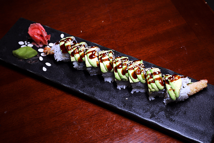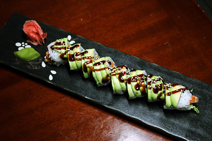 Avocado on top; crunchy shrimp, freshwater eel, cucumber roll with soy caramel sauce with sesame