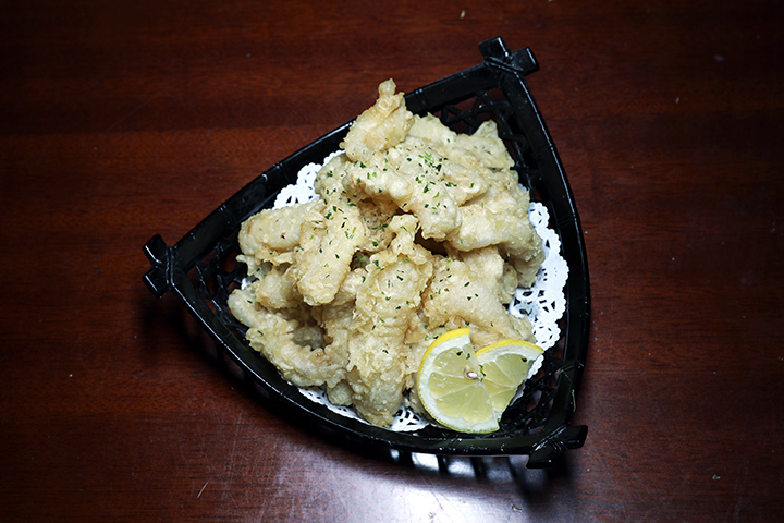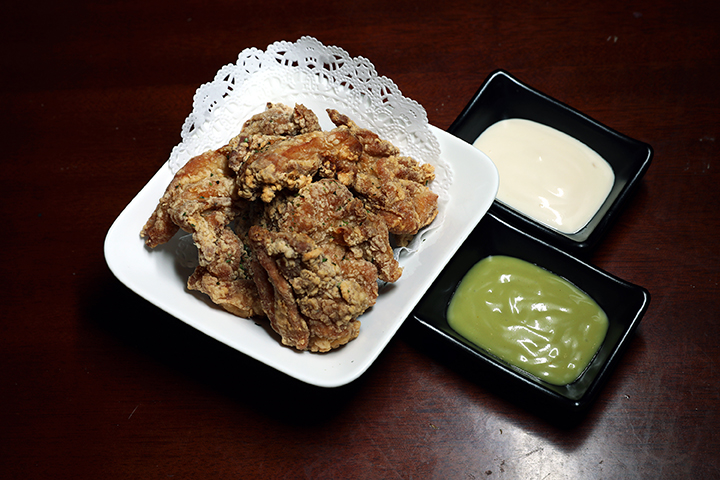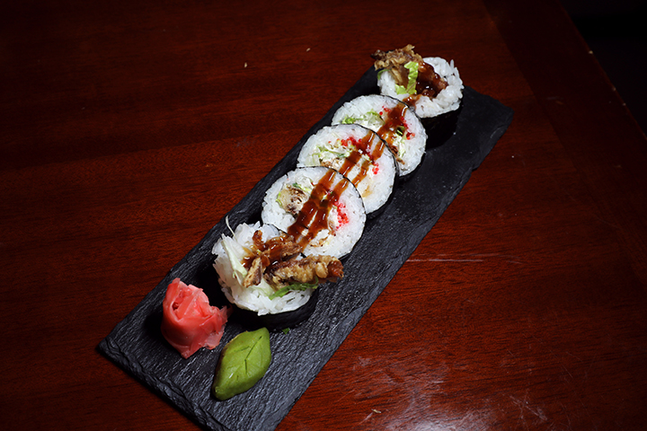 Deep-fried soft shell crab, avocado, romaine flying fish roe, scallions; finished with Japanese worcester sauce and house aioli