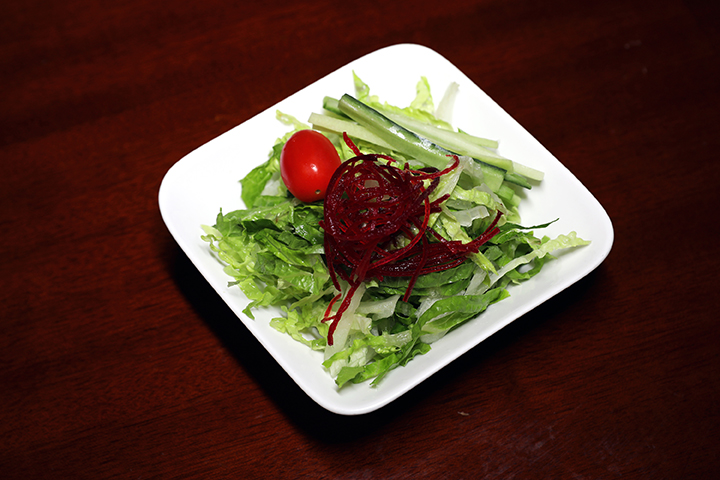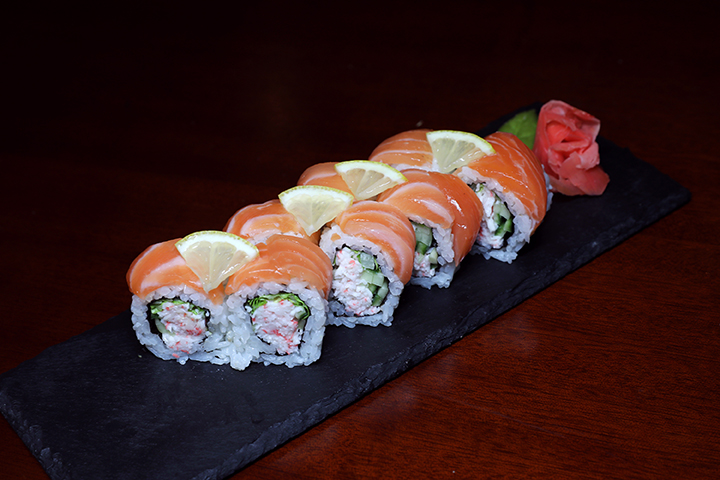Fresh salmon layers on top; crab salad, romaine, cucumber; drizzled with citrus yuzu and lemon slice