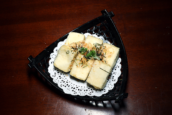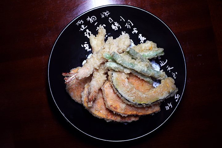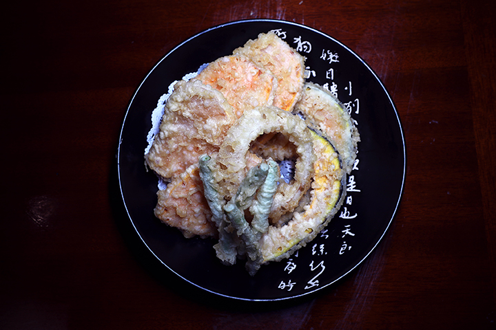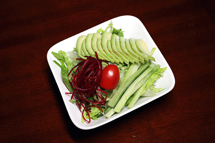 Sweet potato tempura, romaine, scallions, house aioli, soy caramel sauce topped with sliced avocado