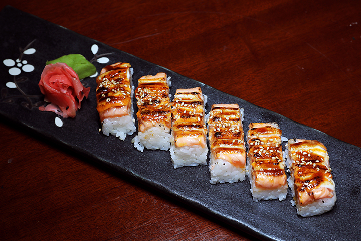 Salmon on top; crunchy shrimp, freshwater eel, cucumber roll with soy caramel sauce with sesame