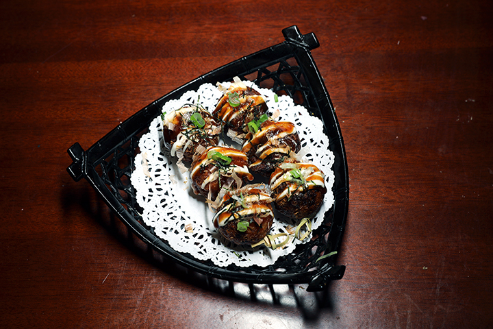 Deep-fried ball-shaped batter with octopus in the centre; garnished with mayo and takoyaki sauce and bonito flakes