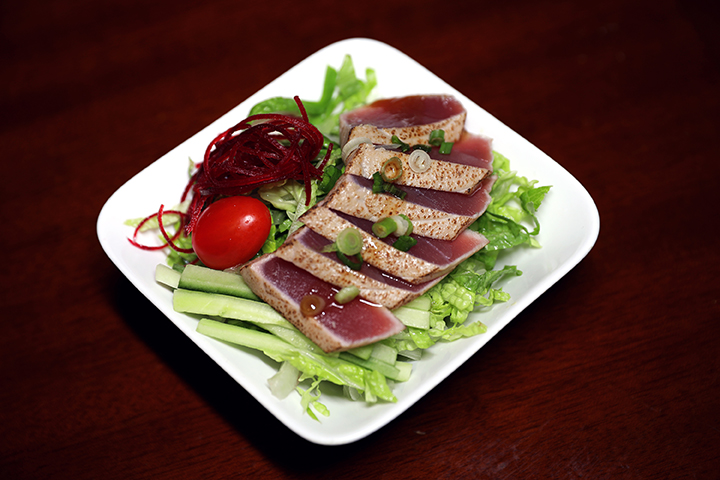 Torched butterfish layers on top; crab salad, romaine, cucumber; finished with garlic soy dressing and scallions