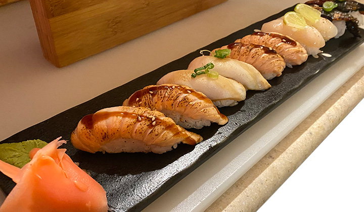 House California Roll, Dynamite Roll, Yuzu Pepper Salmon Roll, Baked Scallop with Truffle Salt Roll (4pcs), Garlic Butterfish Roll (4pcs)