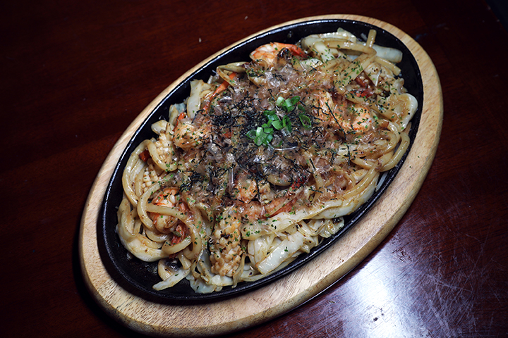 Japanese thick noodle stir-fried in house spicy sauce with vegetables and seafood
